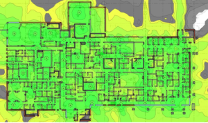 In order to create an accurate heat mapping survey, technology design consultants like our own Brian Cothern, first upload a drawing of the facility into special survey software. The construction materials used for each wall within the facility are then identified – including doors, windows, cubicles, and bathroom stalls – in order to determine its attenuation level (or its ability to potentially interrupt a signal). Take for instance, an elevator and how difficult it is to use a cell phone while inside. Elevator shafts are solid concrete walls and the elevator itself is a metal box. Signals cannot pass through those materials easily.