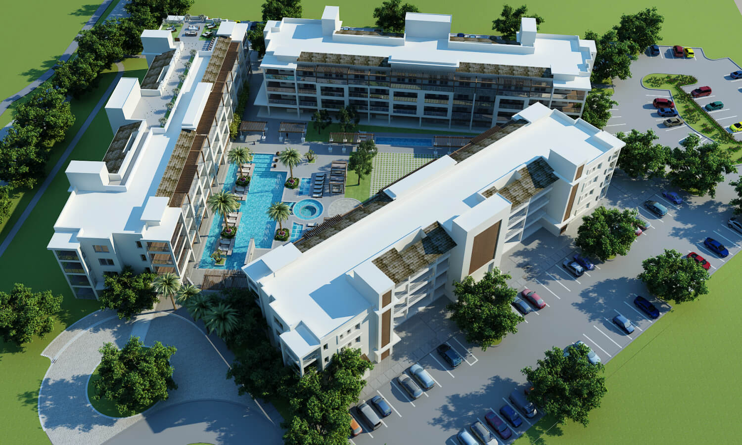 A three building multifamily development. Building One houses a 5,000 sf clubhouse amenity space and Building Three houses a 2,000 sf restaurant. All three buildings face a central pool area.